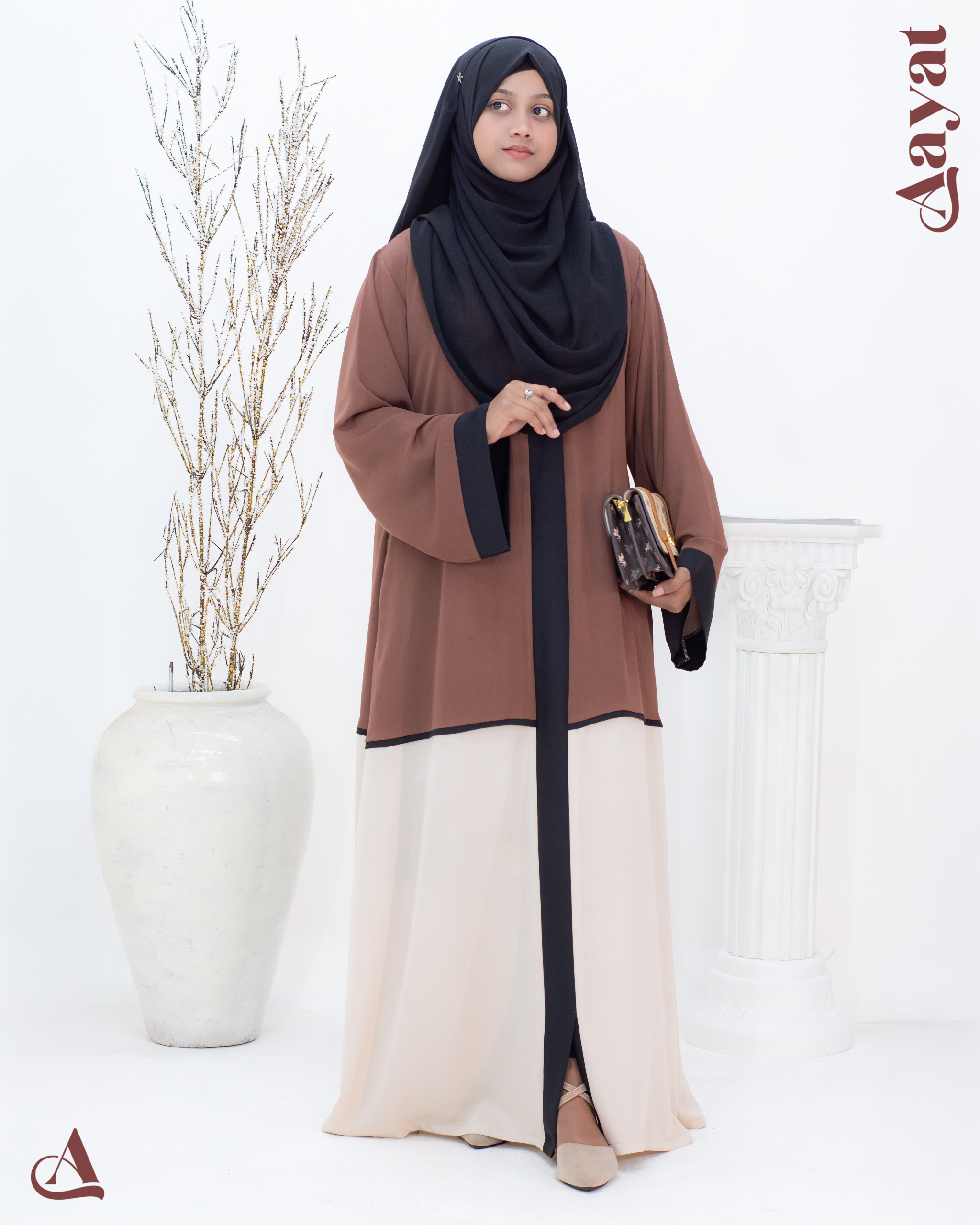 The Abaya Rizwana in coffee and off-white offers a graceful balance of elegance and modern modest fashion. Designed with a rich coffee upper panel and a soft off-White lower layer, complemented by sleek black contrast detailing, this abaya creates a refined and stylish appearance.