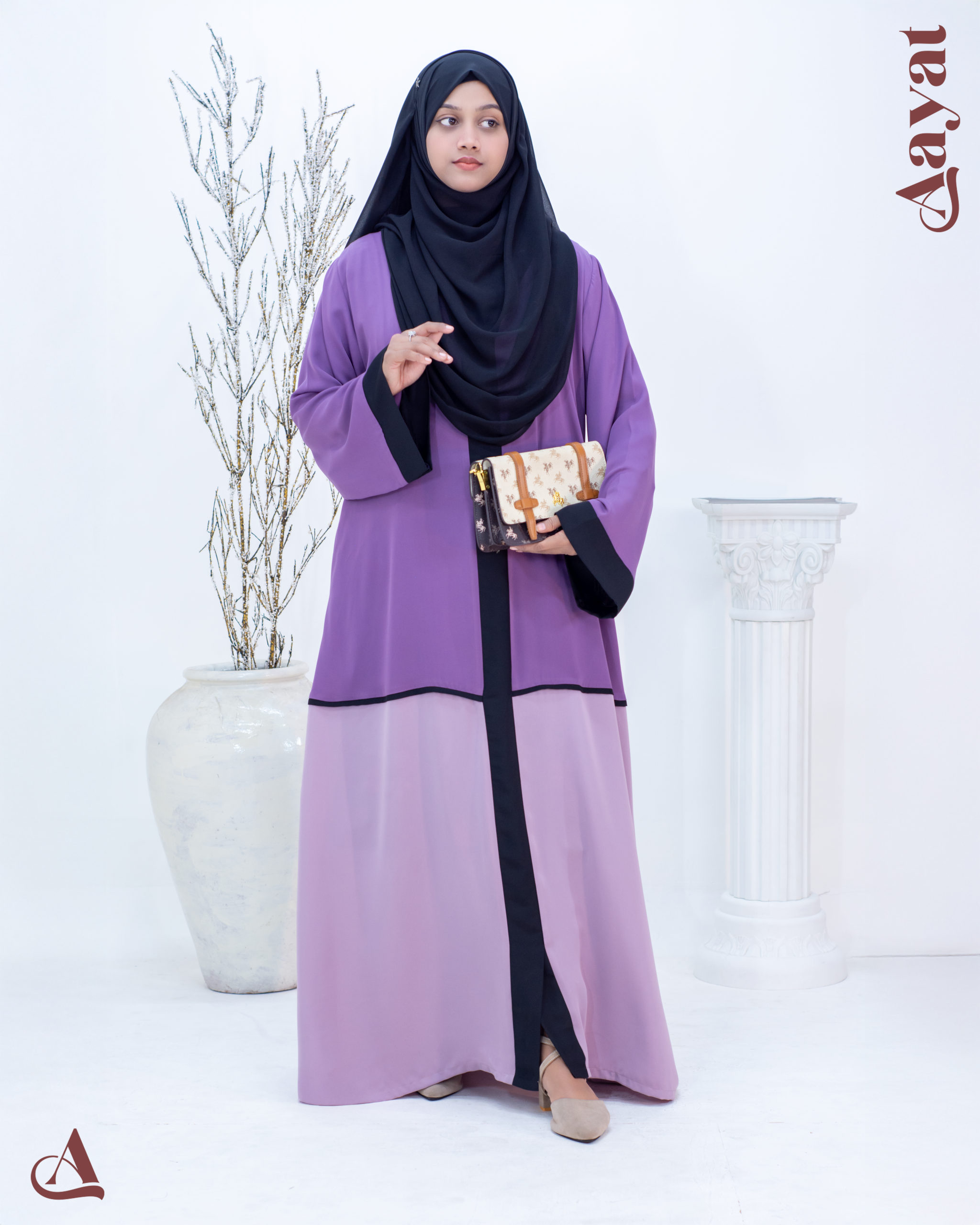 The Abaya Rizwana in Purple & Lavender offers a graceful balance of elegance and modern modest fashion. Designed with a rich purple upper panel and a soft lavender lower layer, enhanced by sleek black contrast detailing, this abaya creates a refined and stylish appearance.