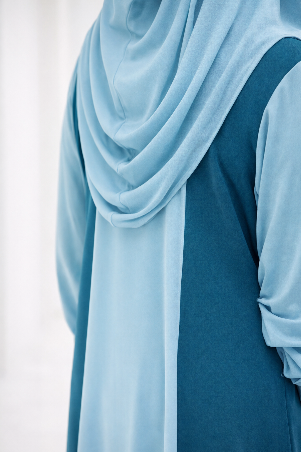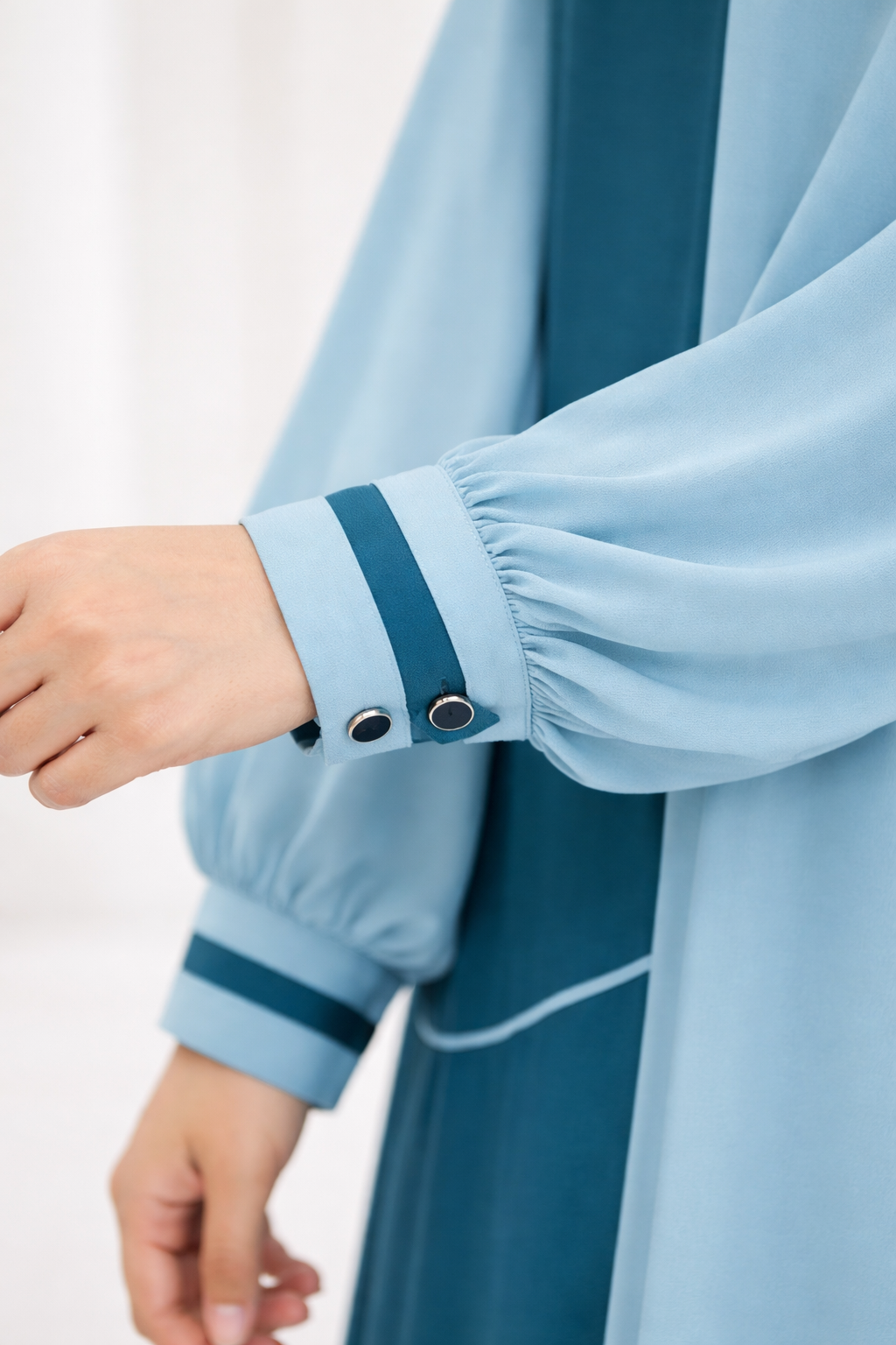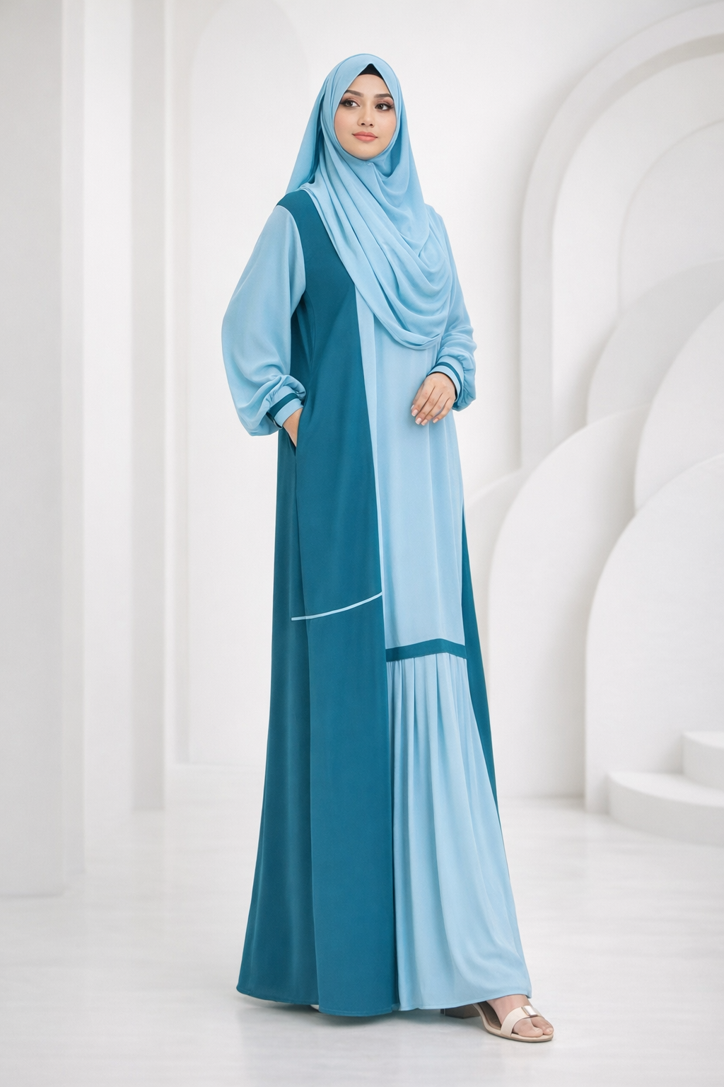 ๐๐๐๐ฒ๐ ๐๐๐ฒ๐ซ๐ โ ๐๐ค๐ฒ ๐๐ฅ๐ฎ๐ & ๐๐๐๐ฅ | ๐๐๐จ๐ฆ๐๐ญ๐ซ๐ข๐ ๐๐ซ๐๐๐ ๐จ๐๐๐๐ ๐ด๐๐๐๐ in a refreshing sky blue and deep teal palette is a masterclass in modernย panelledย design. This ensemble features bold, design a color-blocking and a pleated hemline that adds a rhythmic flow to every step. The soft, contrasting tones create a sophisticated silhouette that is perfect for both daily wear and special gatherings. Because this is where artistic structure meets effortless modesty.