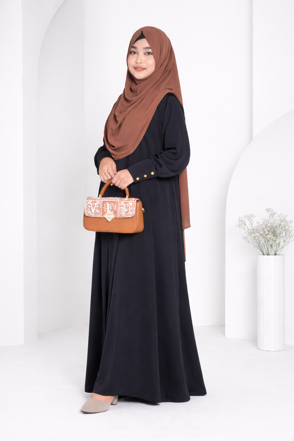 𝑯𝒂𝒏𝒊𝒚𝒂 𝑮𝒐𝒘𝒏 in timeless black is the ultimate expression of sophistication and refined modesty. Designed with clean tailoring and a minimal finish, this gown highlights effortless elegance through its smooth structure and flowing umbrella silhouette.
