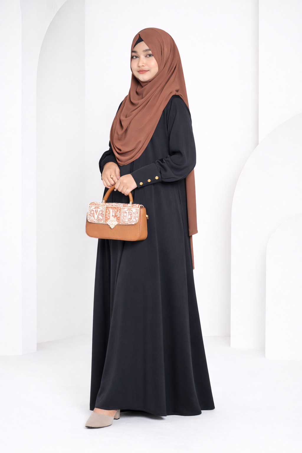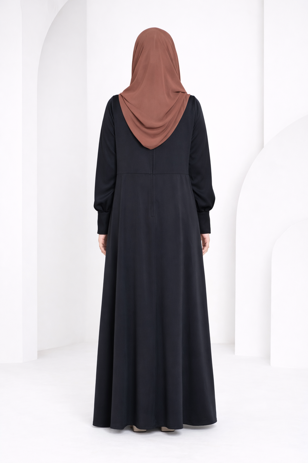 The soft, fluid fabric drapes beautifully, creating a graceful full-length fall with every step, while the subtle sleeve detailing adds a polished and modern touch. Paired with a matching hijab, it delivers a look that is both powerful and poised.