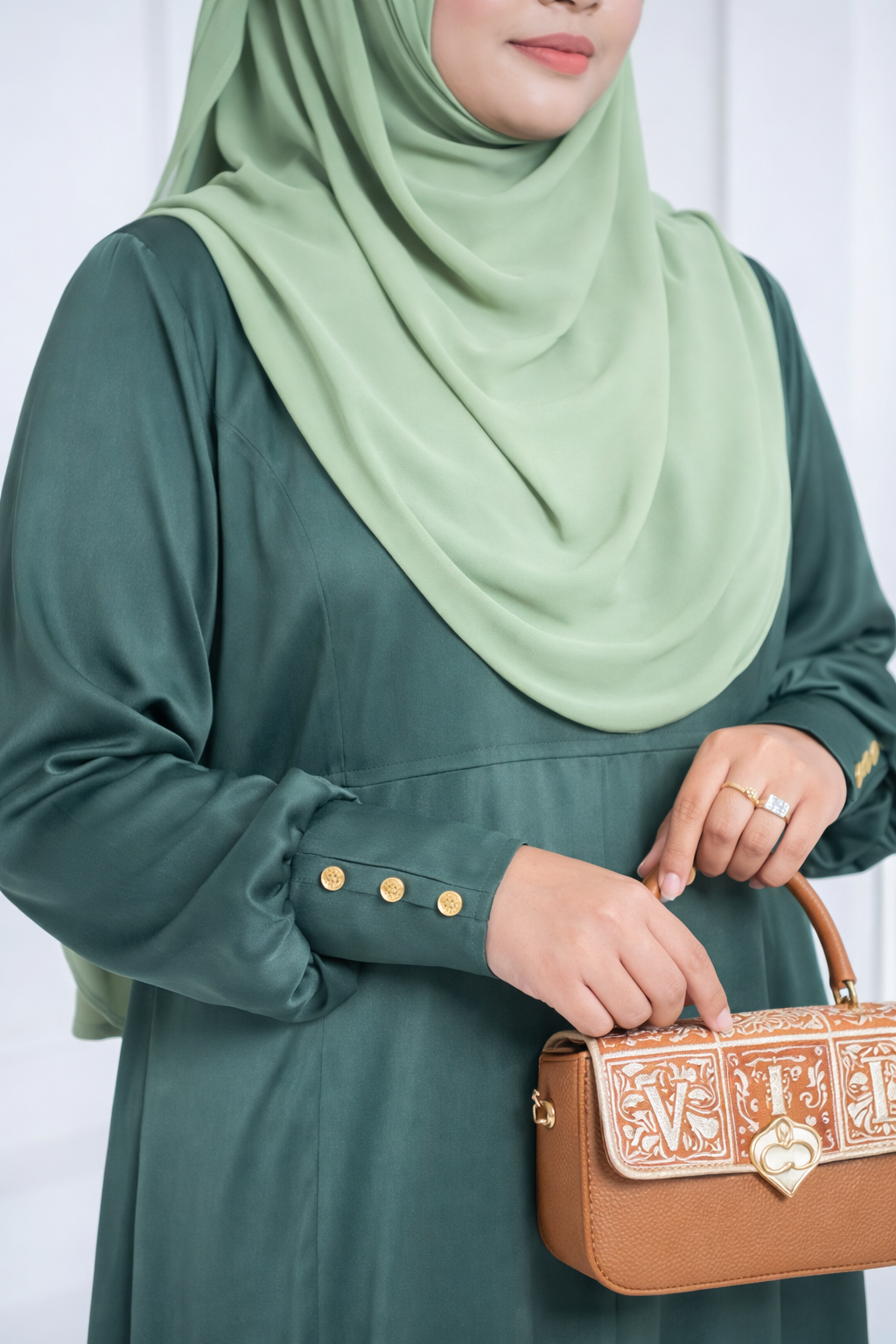 The soft, fluid fabric drapes effortlessly, creating a graceful movement with every step, while the delicate button detailing on the sleeves adds a subtle touch of sophistication. Paired with a matching hijab, it offers a complete look that feels polished, poised, and effortlessly chic.